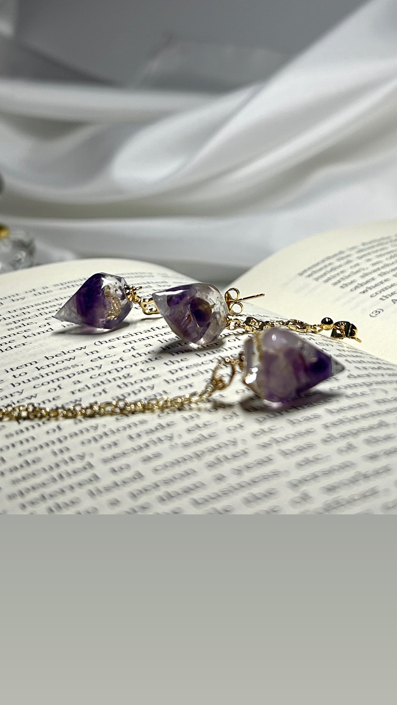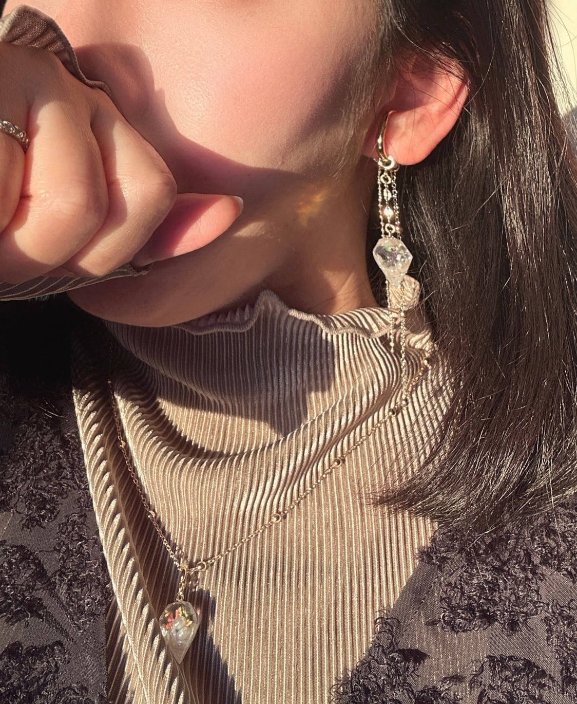 Holidayシーズンを迎える前に アンケートにご協力いただき、 その想いをもとに完成した アメジストのジュエル。 ただ、ジュエルの中に アメジストを“ぎゅっと詰めている” わけではないんです。 アメジストには 色の濃いもの、淡いもの。 形も、大きさも、すべて違う。 それはまるで、人と同じだなぁと。 ひとつとして同じものはない その唯一無二のかけらを 色味と形のバランスを見ながら 組み合わせて、外から見たとき、 いちばん美しく輝くように 何度も試作と研究を重ねて 一粒一粒、積み上げています。 アメジストの隙間には、 金沢で仕入れた純金箔を。 高価ではありますが、 金箔風とはまったく違う 本物ならではの輝きがあります。 金は邪気を跳ね返す力があると 言われています。 この美しさに惚れ込み、 今はずっと、この金箔だけを 使い続けています。 以前は既製品のサージカルステンレス ネックレスを使用しておりました。 ですが、皆様にもっとご満足のいくものを お届けしたい。 そう強く思うようになり、14kgf素材を 入れて、自身で一からチェーンを繋ぎ合わせて ネックレスをお仕立てしております。 その分お値段が以前よりも 上がってしまい申し訳ありません。 ご理解頂けますと幸いです。 ⸻ 素材について Jewelry Parts ジュエル大きさ 横約2センチ 縦1.5センチ 重さ 約3g(1つ) ヒートン ┊ 14kgf 丸カン ┊ サージカルステンレス チェーン ┊ 14kgf デザイン丸カン ┊ 日本製高品質16GP ⸻ ピアス/イヤリング(選択可) フックピアス ┊ サージカルステンレス or 14kgf ポストピアス ┊ サージカルステンレス or 14kgf ネジバネイヤリング ┊ 日本製高品質16GP or 14kgf ⸻ ネックレス ヒートン ┊ 14kgf バチカン ┊ 14kgf チェーン ┊ 14kgf 丸カン ┊ サージカルステンレス ひきわ┊ サージカルステンレス Holidayの光をまとった このーSizukaーが 今年の締めくくりに 静かに寄り添えますように