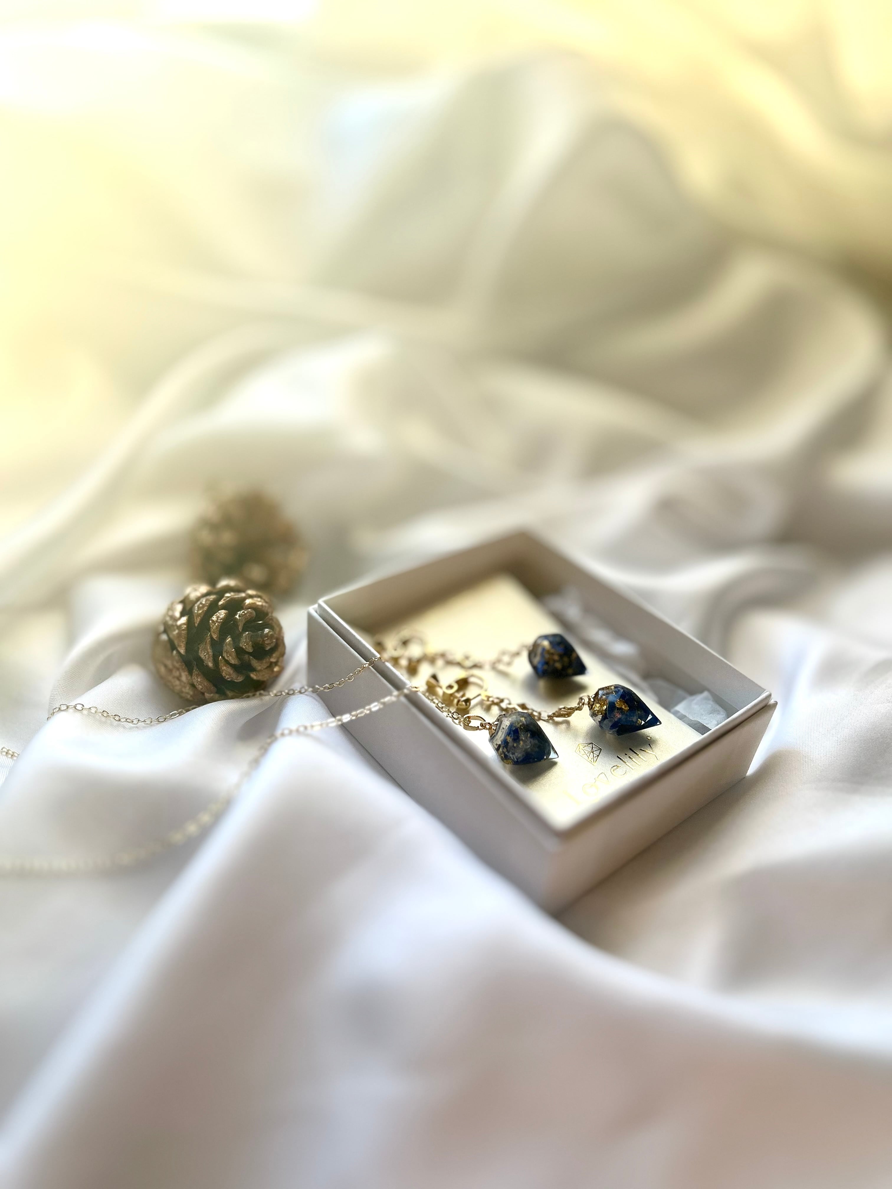 蒼依ーAoiー — Keeper of Inner Truth — Holiday前のアンケートでも人気の高かった ラピスラズリ。 私も子供の頃から大好きな石の1つです。 その、ラピスラズリ 古くから「真実」「直感」「人生の軸」を 象徴してきた特別な石です。 まるで夜空のような深い青は、 感情をかき立てるのではなく、 心のノイズを静かに沈め、 本当に大切な想いだけを浮かび上がらせる 力があると言われています✨ 蒼依(Aoi)は、 やさしく慰める石ではありません。 代わりに、 逃げずに向き合う静けさを 与えてくれる存在になります。 周りに合わせすぎたとき、 自分の気持ちが分からなくなったとき。 そっと問いかけます。 「あなた、本当はどうしたい?」 ⸻ ラピスラズリのお色には濃淡や 独自の模様があり 全く同じものはありません。 形と、バランスを見ながら、一つ一つ デザインを積み上げてお作りしております。 そして、ラピスラズリの隙間には、 金沢で仕入れた純金箔を。 高価ではありますが、 金箔風とはまったく違う 本物ならではの輝きがあります。 金は邪気を跳ね返す力があると 言われています。 この美しさに惚れ込み、 今はずっと、この金箔だけを 使い続けています。 ただ、その分お値段が以前よりも 上がってしまい申し訳ありません。 そして過去一好きなチェーンは いつも使用しているものの 2倍の価格なんです。 最後まで悩みましたが、 Holidayシーズンにふさわしい 存在感のある このフラワーチェーンに決めました。 Holidayの光をまとった このーAoiーが 今年の締めくくりに 静かに寄り添えますように ⸻ Jewelry Parts ジュエル大きさ 横約2センチ 縦1.5センチ 重さ 約3g(1つ) 素材について Jewelry Parts ヒートン ┊ 14kgf 丸カン ┊ サージカルステンレス チェーン ┊ 14kgf デザイン丸カン ┊ 日本製高品質16GP ⸻ ピアス/イヤリング(選択可) フックピアス ┊ サージカルステンレス or 14kgf ポストピアス ┊ サージカルステンレス or 14kgf ネジバネイヤリング ┊ 日本製高品質16GP or 14kgf ⸻ ネックレス ヒートン ┊ 14kgf バチカン ┊ 14kgf チェーン ┊ 14kgf 丸カン ┊ サージカルステンレス ひきわ┊ サージカルステンレス