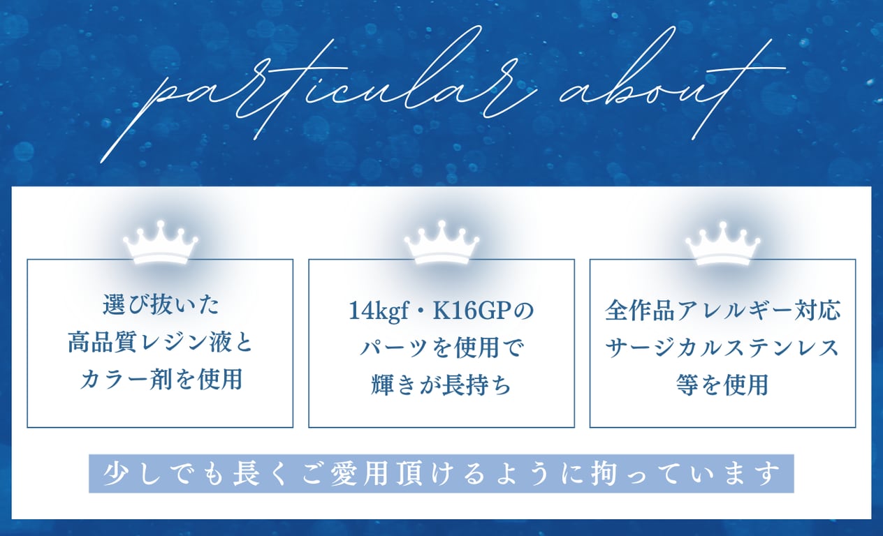 ◎変色しにくい高品質レジン液を使用しておりますが、それでも紫外線に長時間当たることによって、風合いや色が変わる場合がございます。綺麗な輝きを保つ為、直射日光を避けて保管をお願い致します。